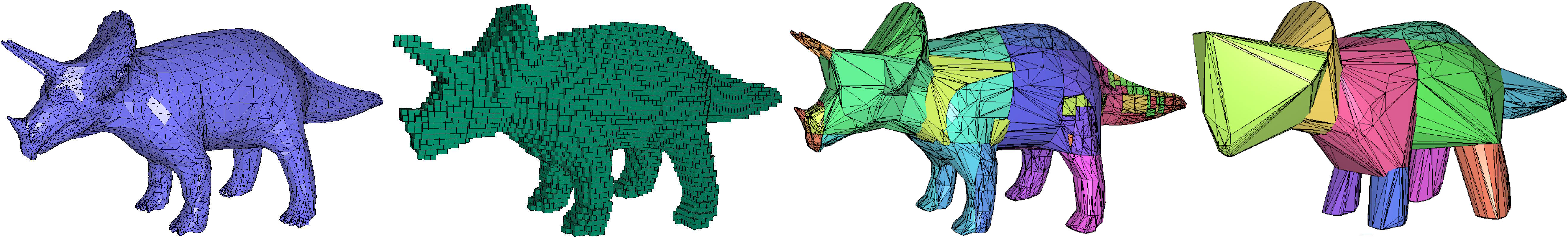+Approximate convex decomposition pipeline.\n From left to right: 1. input mesh 2. voxel grid 3. convex volumes after error-driven splitting 4. final convex volumes after merging