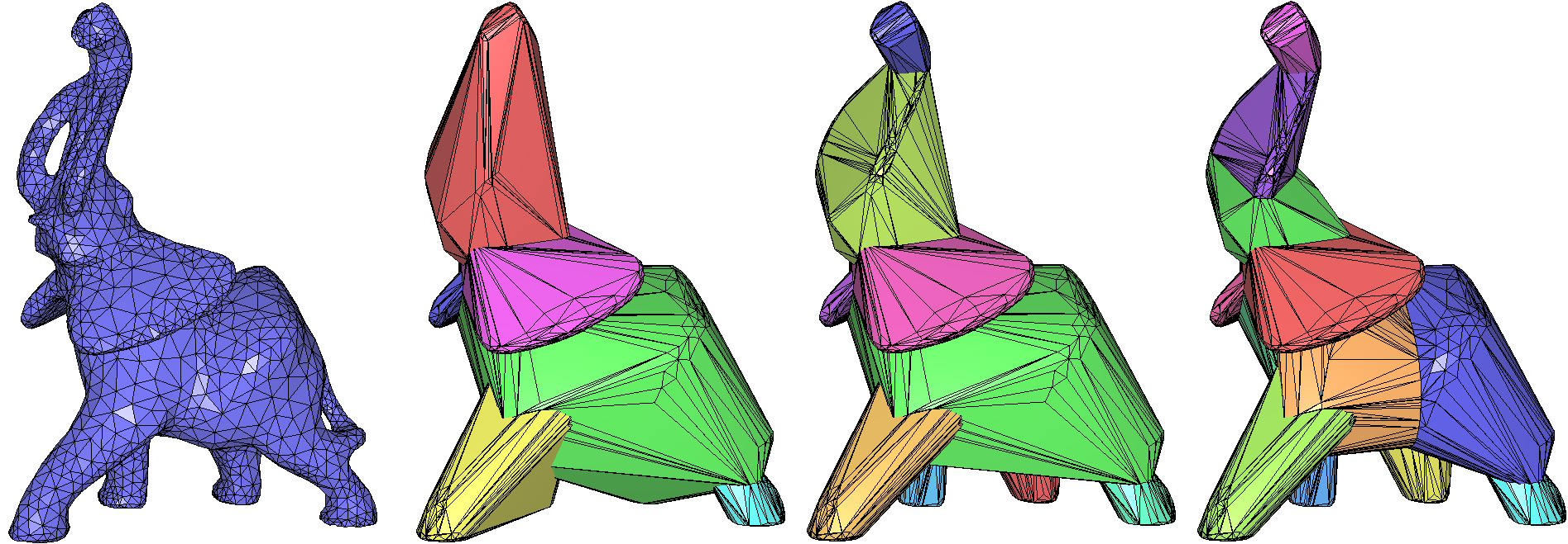 +Approximate convex decomposition of the elephant.off model.\n From left to right: input mesh, 6, 9, and 12 convex volumes